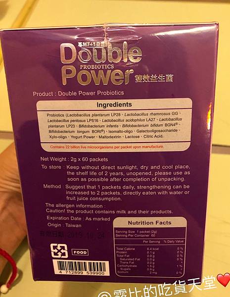 盒子側邊印了很詳細的菌種跟成分、容量、有效期限...等等的詳細資訊